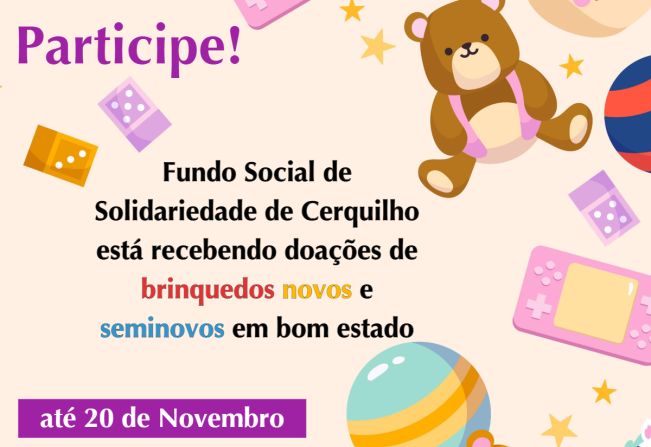 O Fundo Social de Solidariedade de Cerquilho está recebendo doações de brinquedos novos e seminovos em bom estado, até 20 de novembro, para realizar uma entrega especial de Natal para as famílias atendidas pelo departamento.